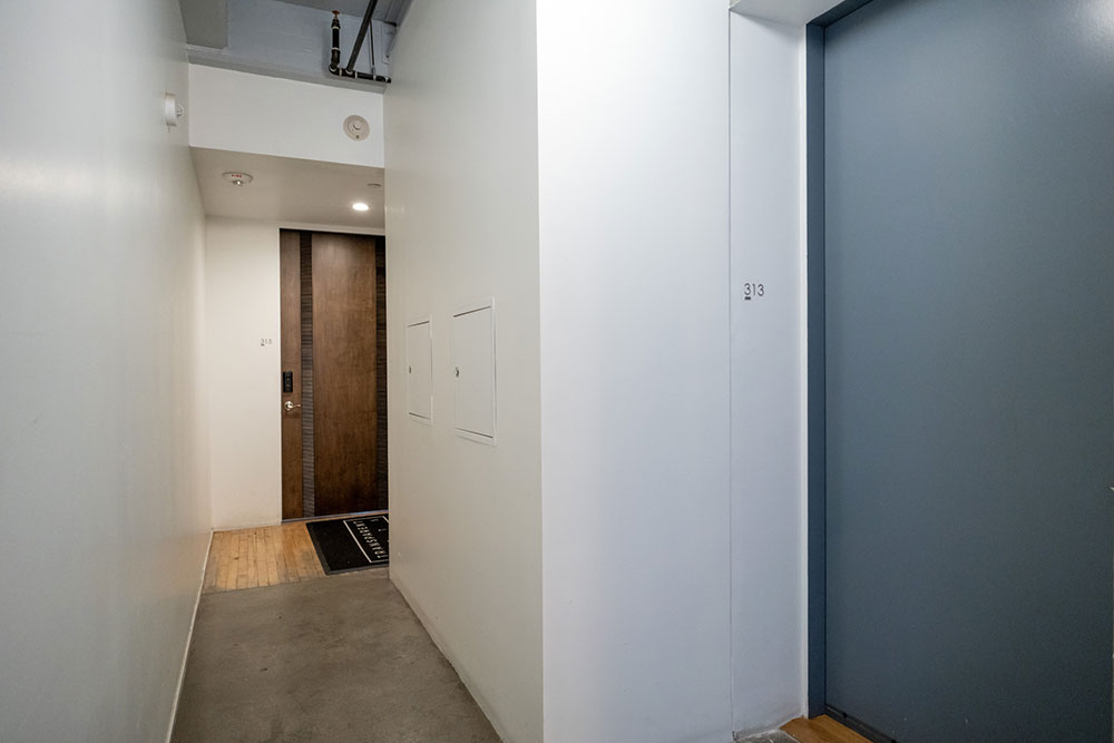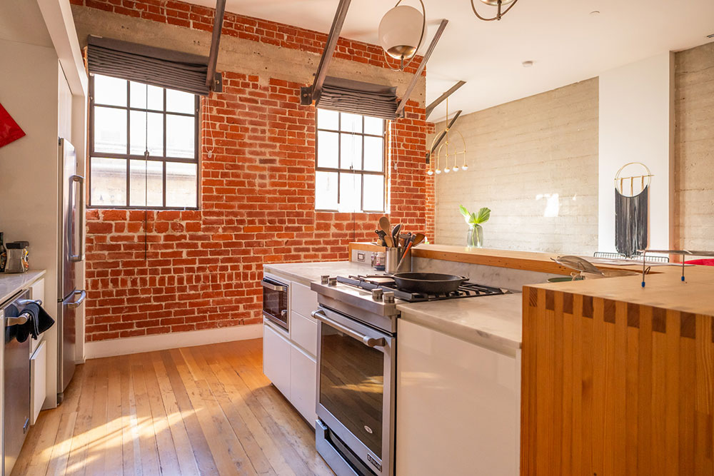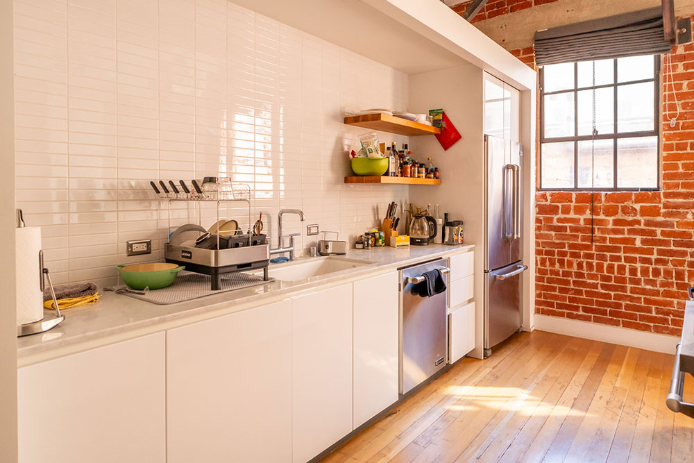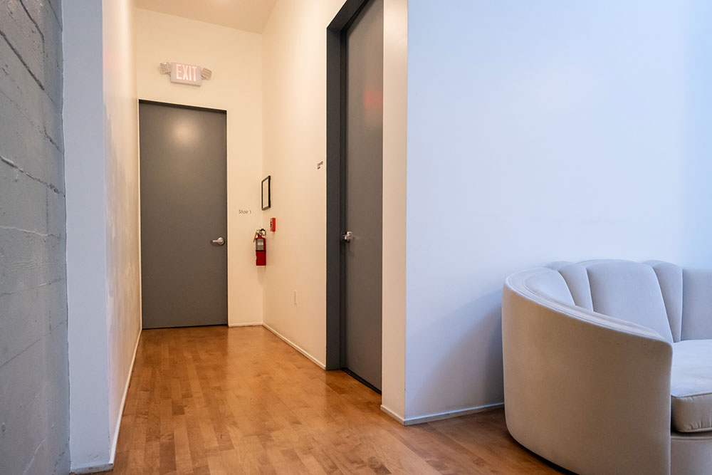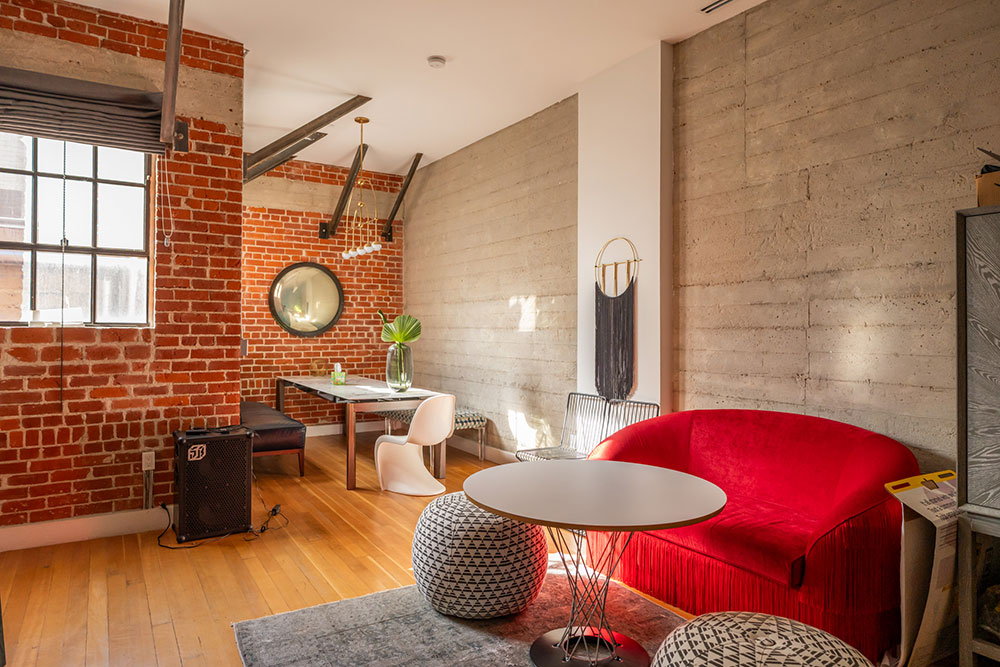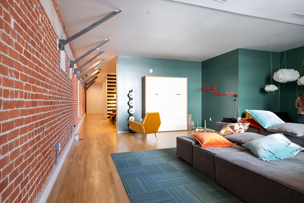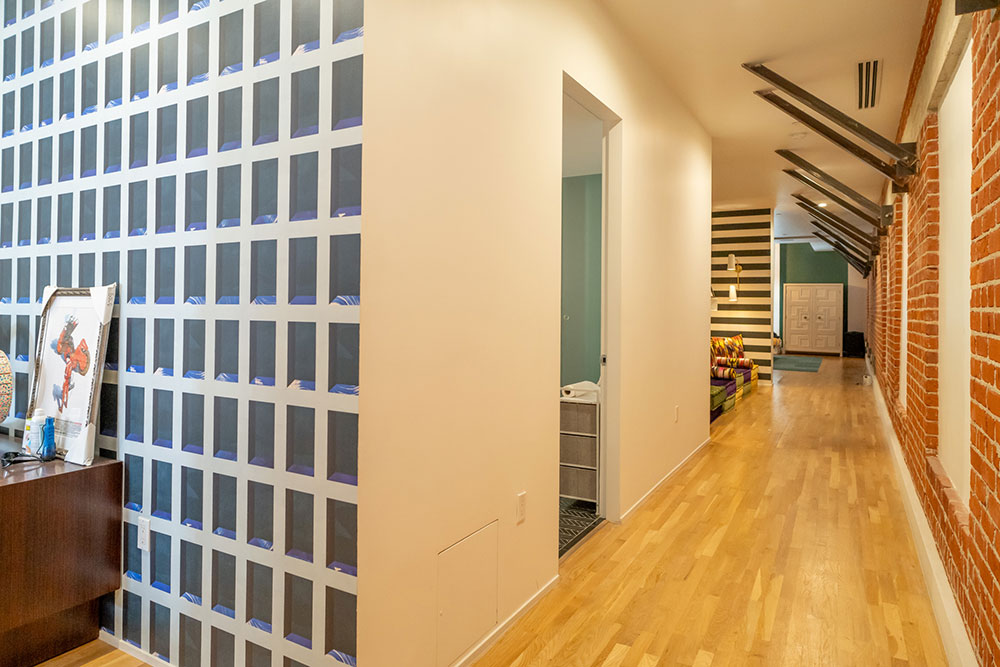 This loft can cheat any city living space in places like the very trendy Williamsburg area of Brooklyn, DTLA or San Francisco. Or any other urban area where you would find a modern loft with one wall of exposed brick and way too high rent! It is fully equipped and furnished. The hallway leading to this space has white and gray painted cement blocks and steel loft doors.